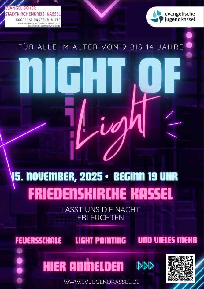 Dieses besondere Angebot der Kinderkirchen im Kooperationsraum Kassel Mitte gemeinsam mit der Evangelischen Jugend Kassel richtet sich an alle Kinder und Jugendlichen von 9 bis 14 Jahren und ist kostenlos. Anmeldung über den QR-Code auf dem Plakat.