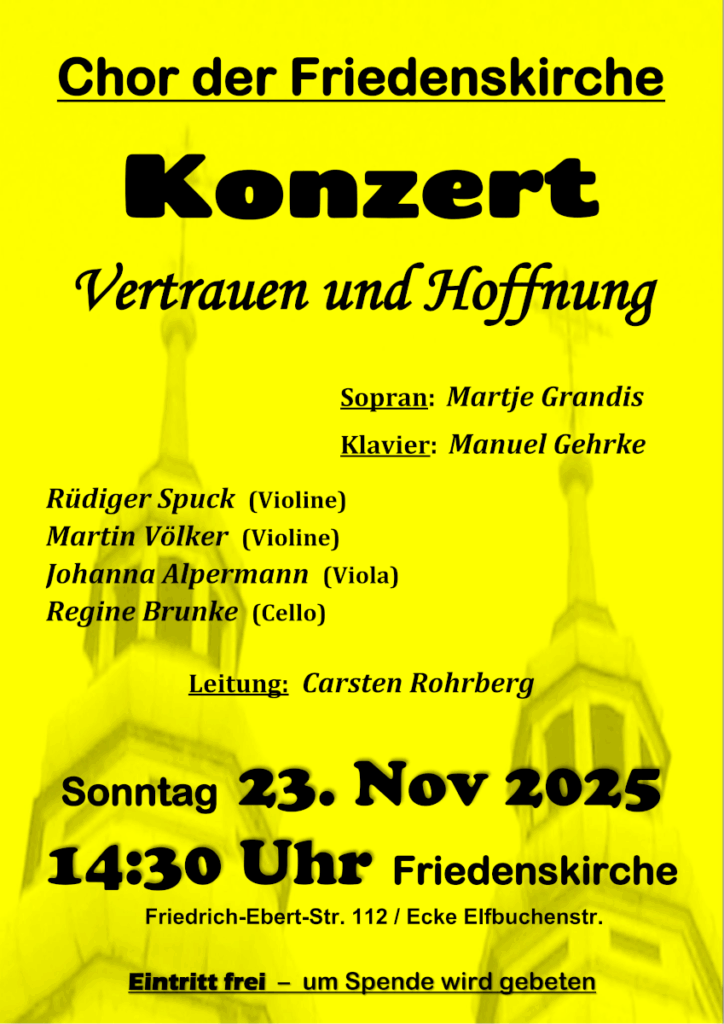 Konzert Vertrauen und Hoffnung Eintritt frei – um Spende wird gebeten 14:30 Uhr Friedenskirche Friedrich-Ebert-Str. 112 / Ecke Elfbuchenstr., Sonntag
