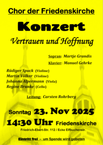 Konzert Vertrauen und Hoffnung Eintritt frei – um Spende wird gebeten 14:30 Uhr Friedenskirche Friedrich-Ebert-Str. 112 / Ecke Elfbuchenstr., Sonntag 23. Nov 2025 Chor der