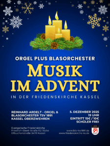 Orgel plus Blasorchester Musik im Advent – Friedenskirche Kassel Reinhard Ardelt – Orgel & Blasorchester TSV 1891 Kassel-Oberzwehren 5.12.2025, 19:00 Uhr Eintritt 15 € /
